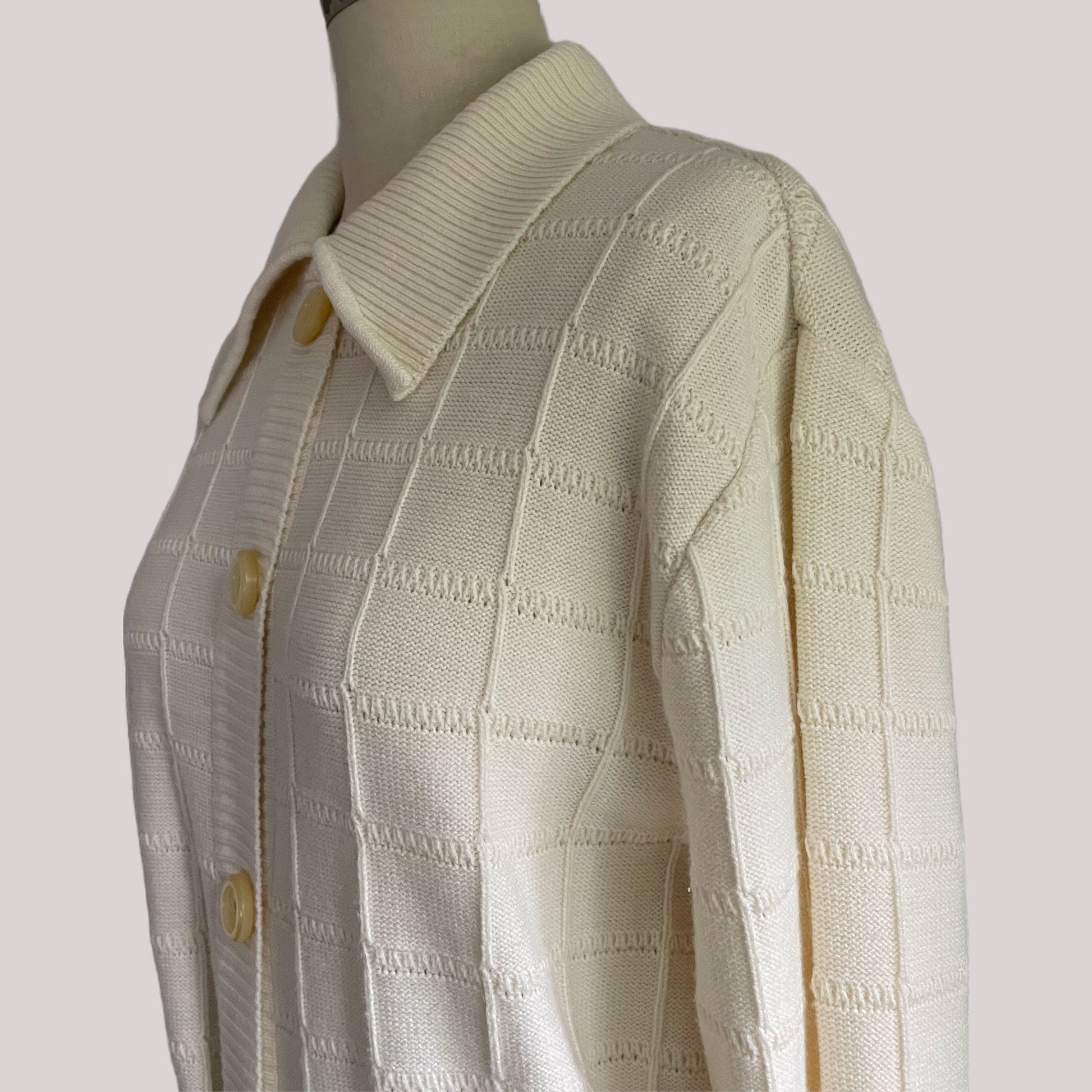 Vintage lattice with seed stitch knit cardigan with collar, functional patch pockets, versatile cuffs, and belt. Made to perfection in Romania and in mint condition.