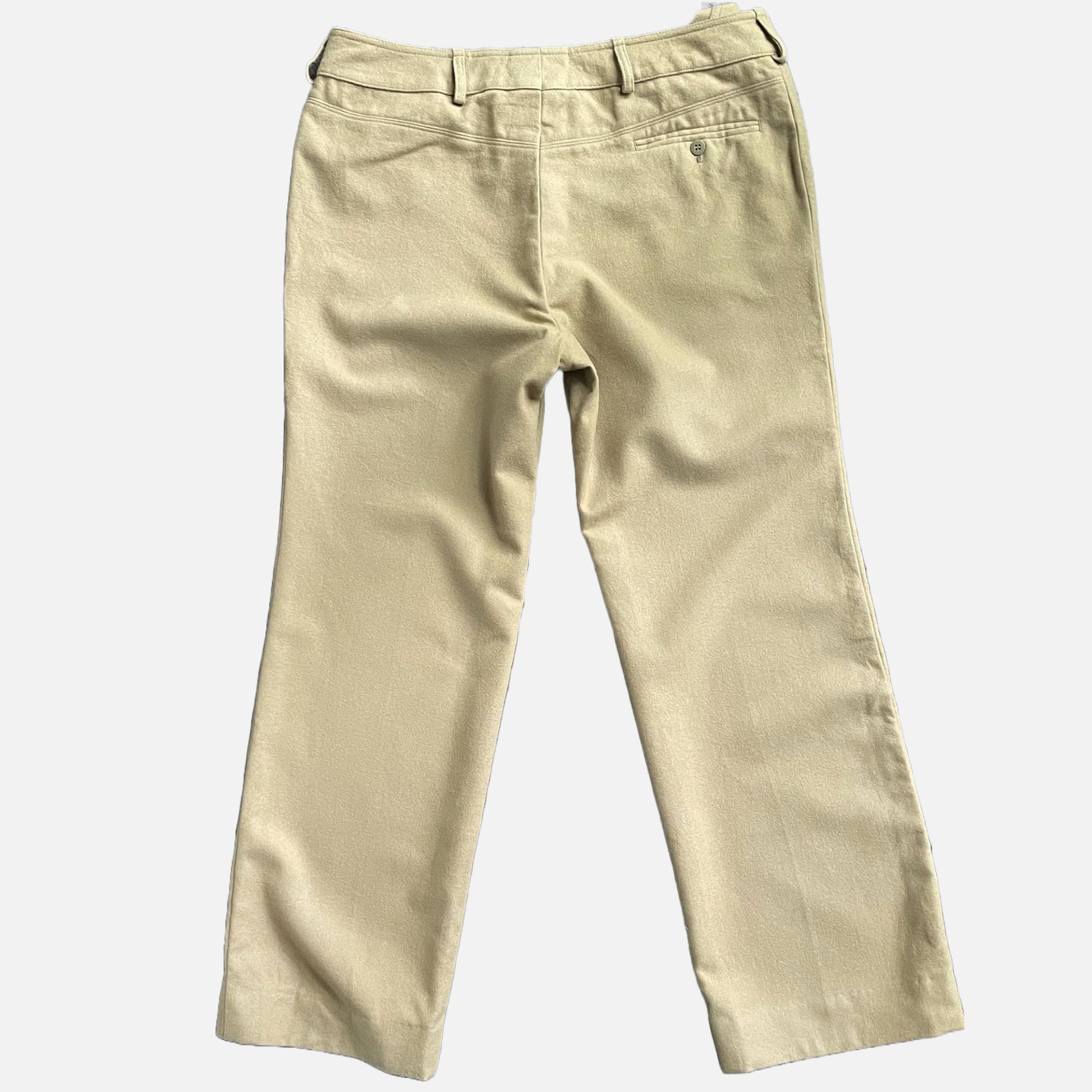 Vintage camel wide leg pants with functional front pockets and felted back pocket. Metal zipper closure center front with two buttons on the waistband by Marald Roma