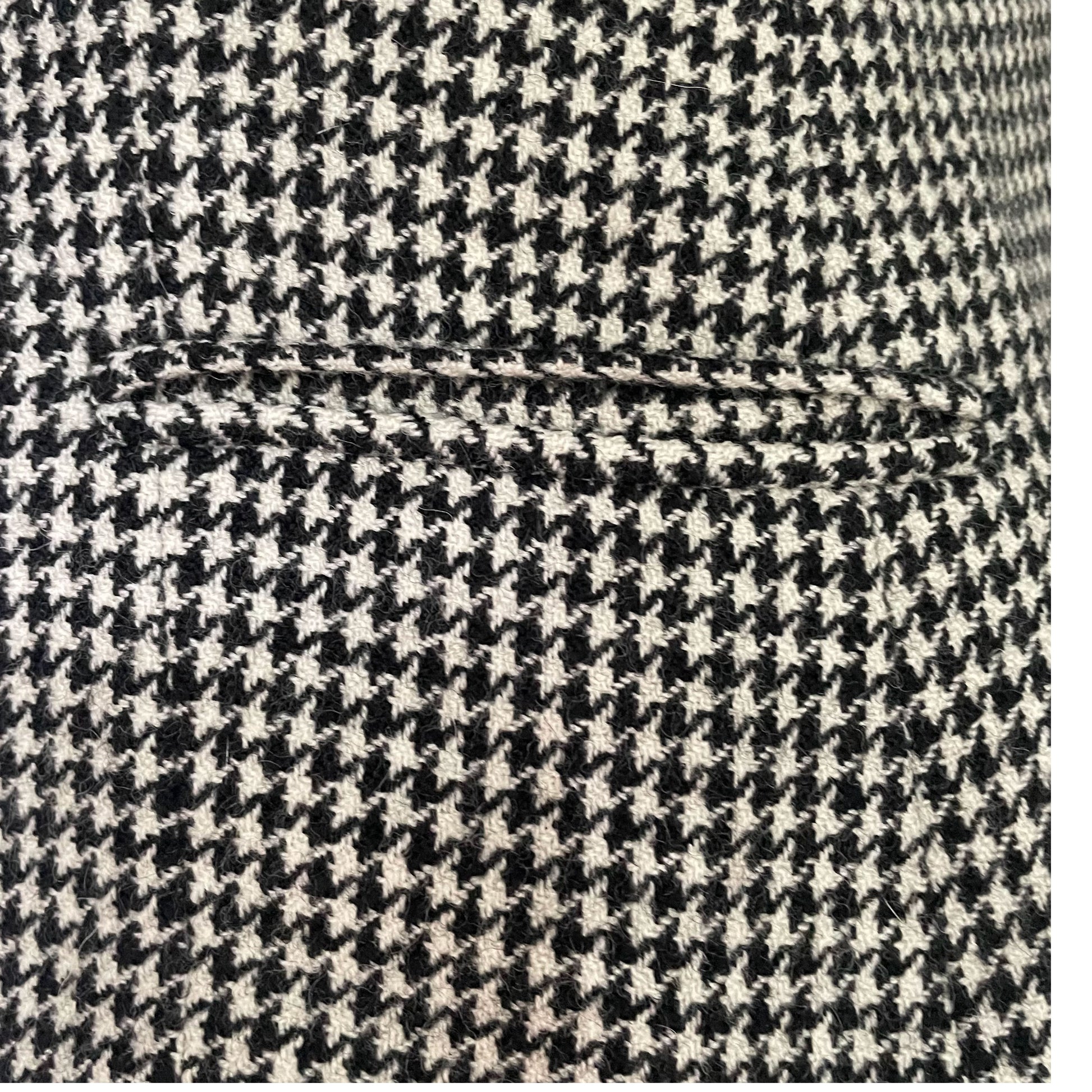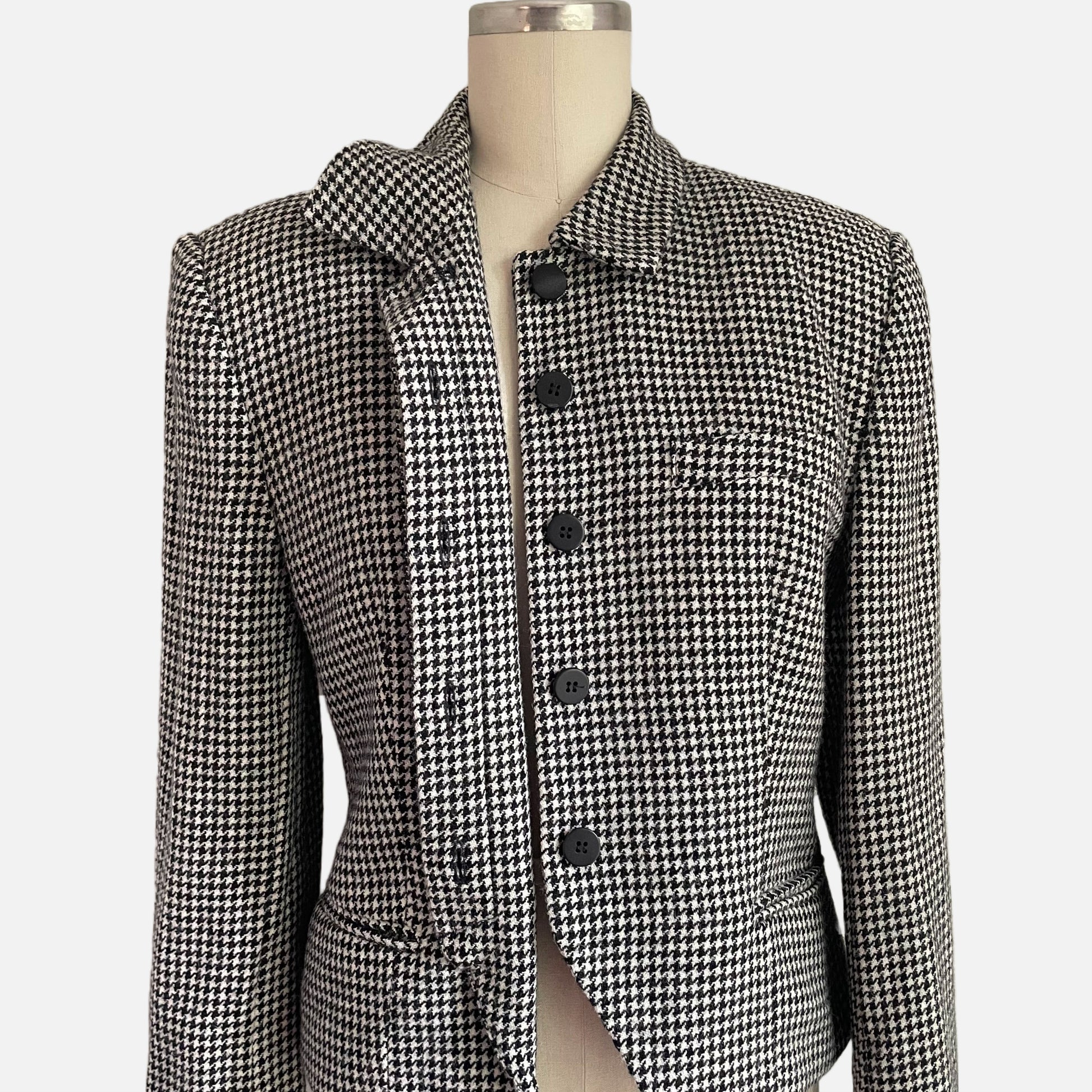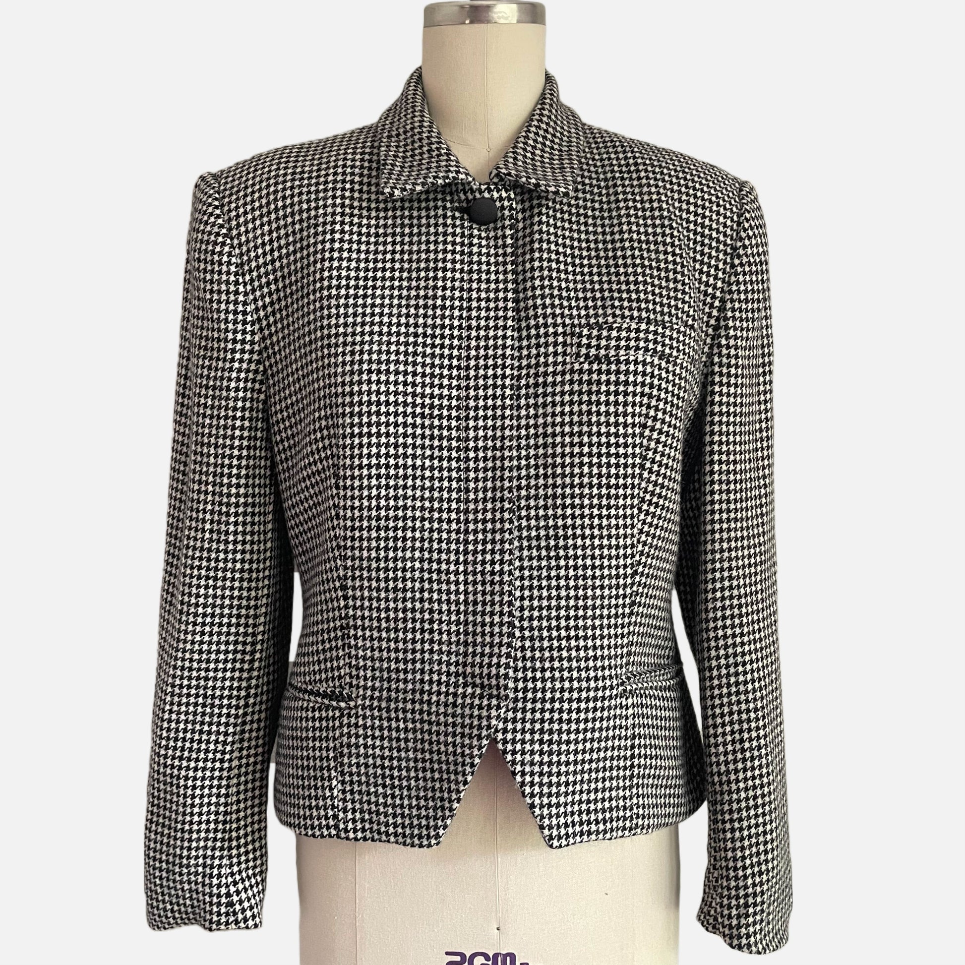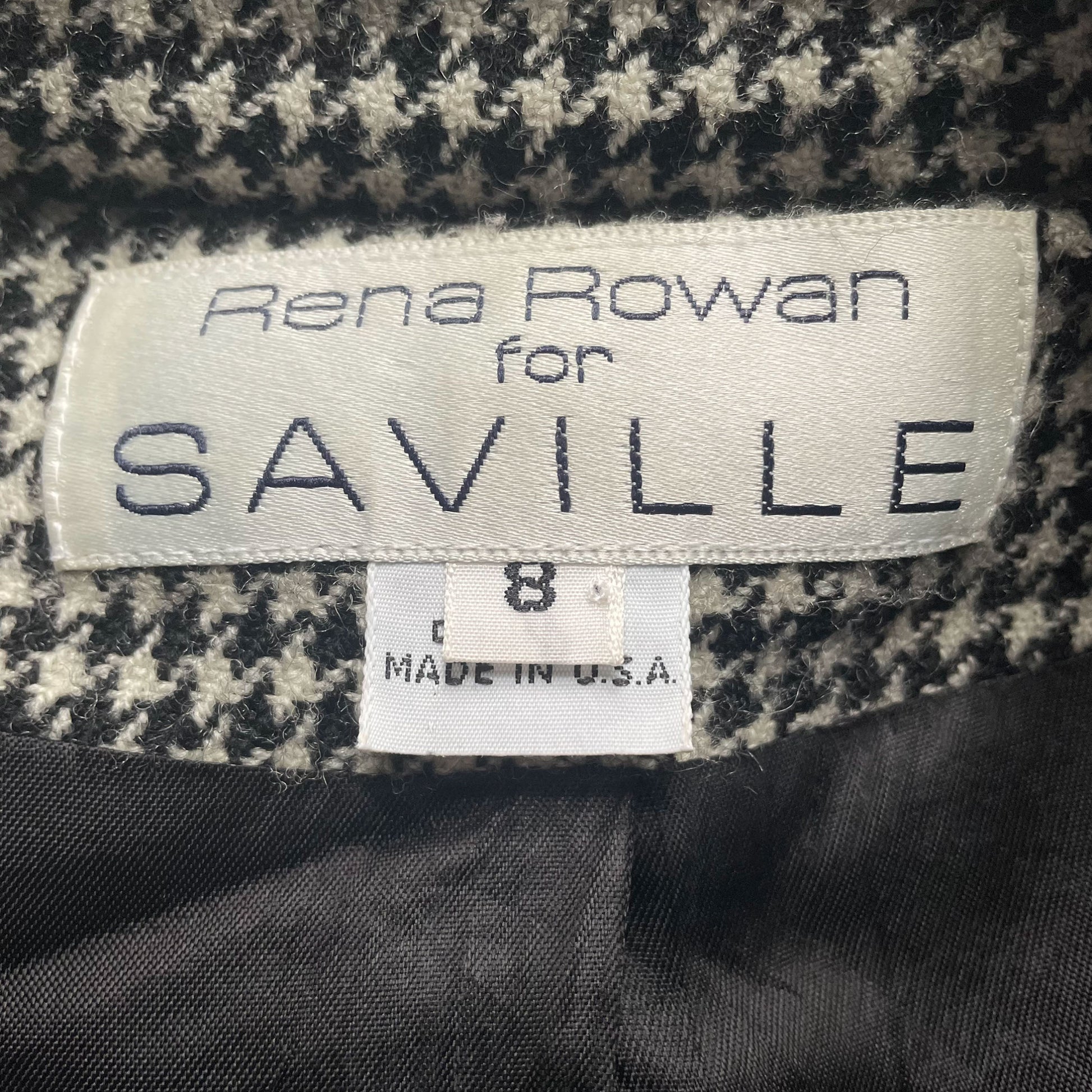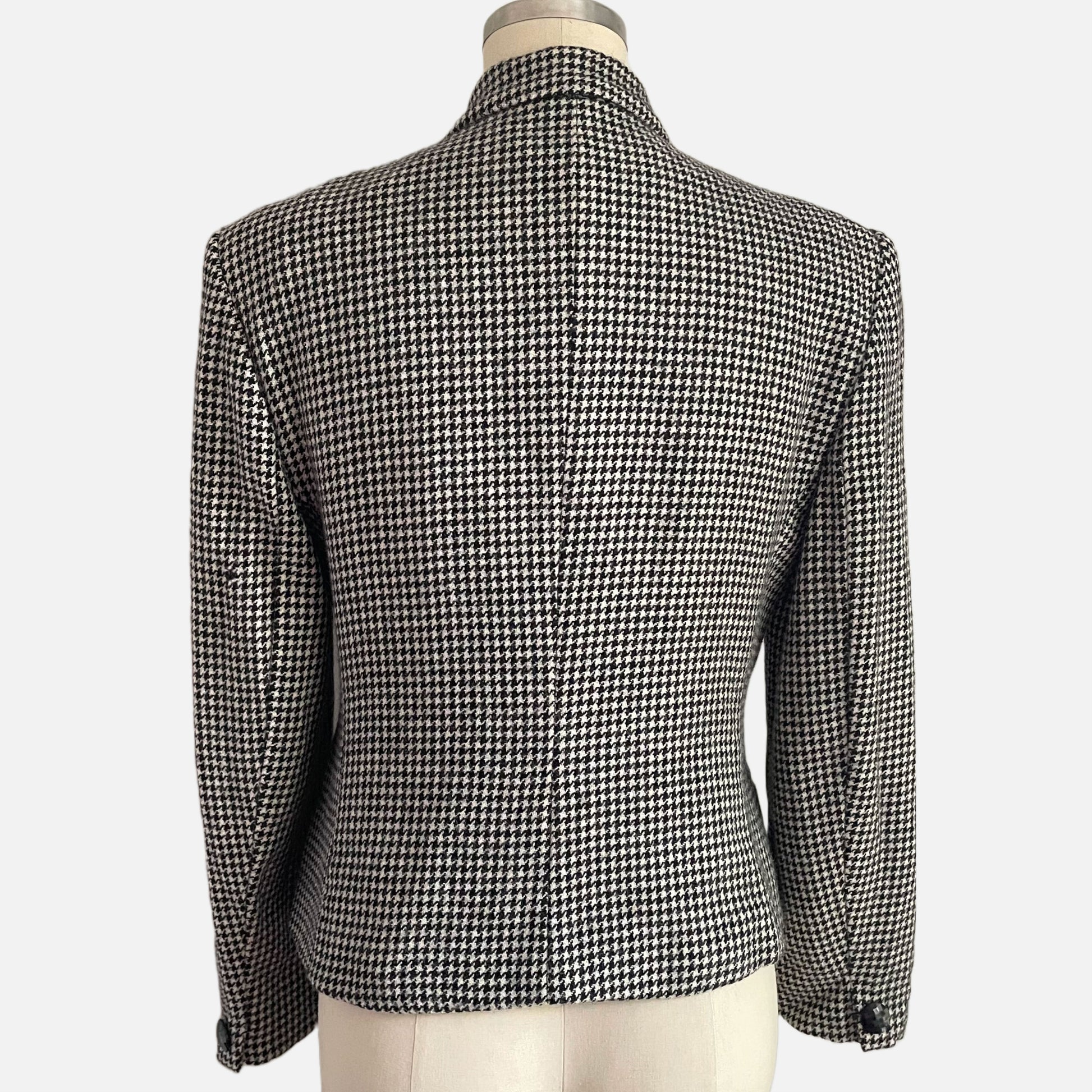 Vintage black and white houndstooth fully lined suit jacket with non-functional piped pockets by Rena Rowan for Saville.