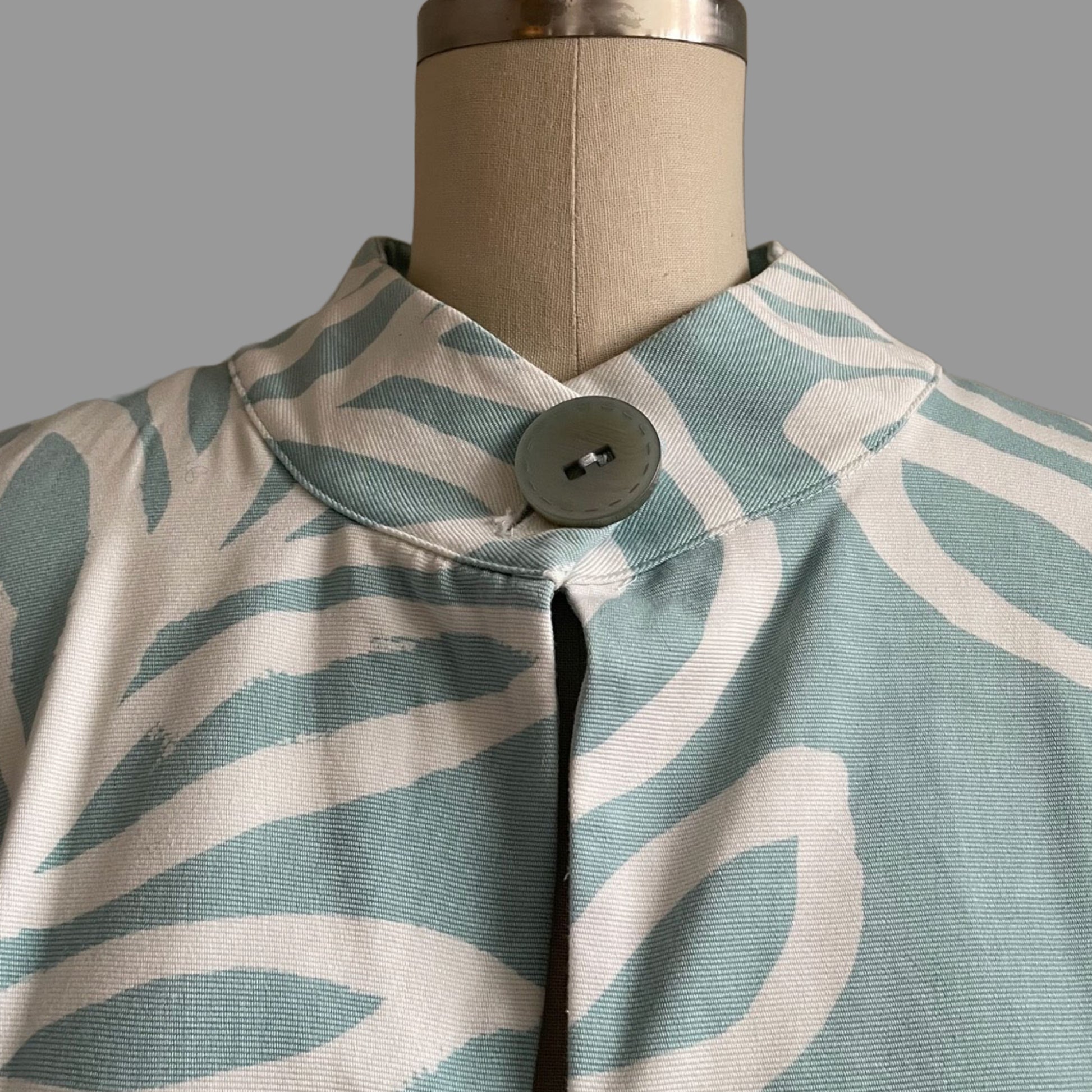 Vintage mint and white jacket with mandarin collar by Virginia Taylor. Button closure at neckline, includes functional side seam pockets, and is fully lined.