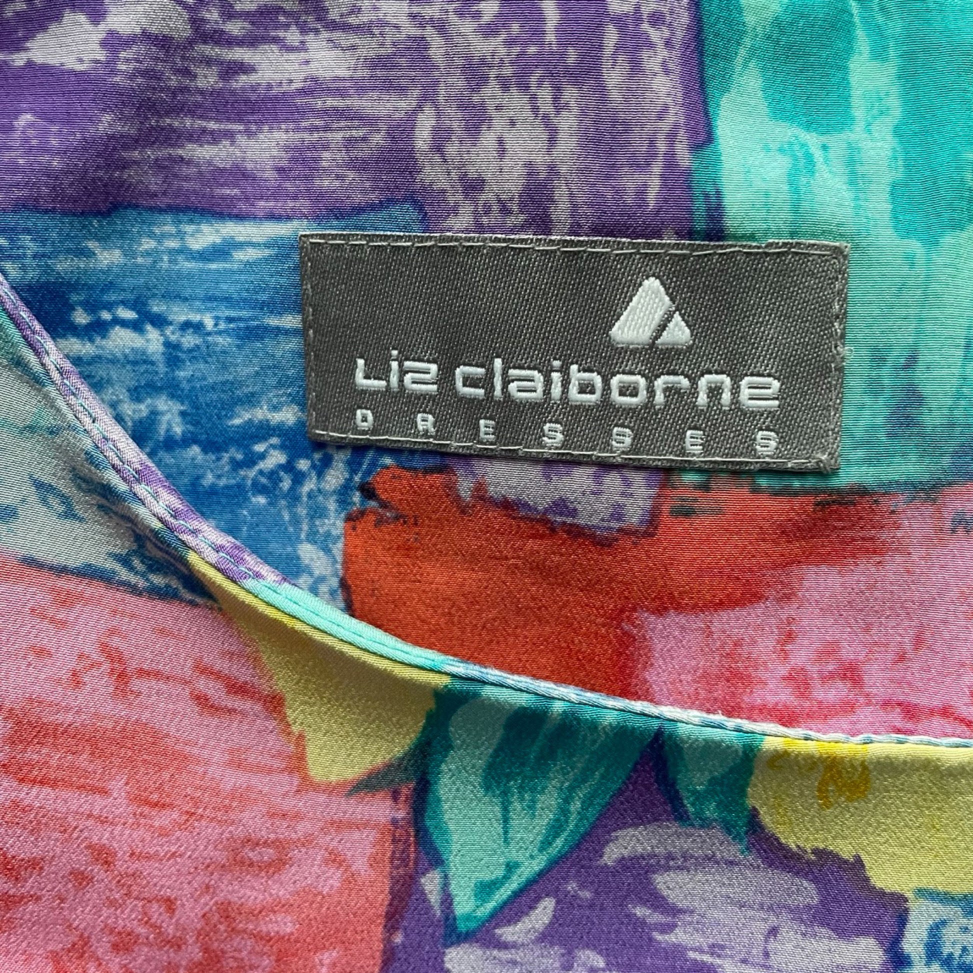 Vintage 100% silk multi print, short sleeve, mini dress by Liz Claiborne Dresses. Dress has a zipper down the center back, pleated hems, with shoulder pads and is fully lined.